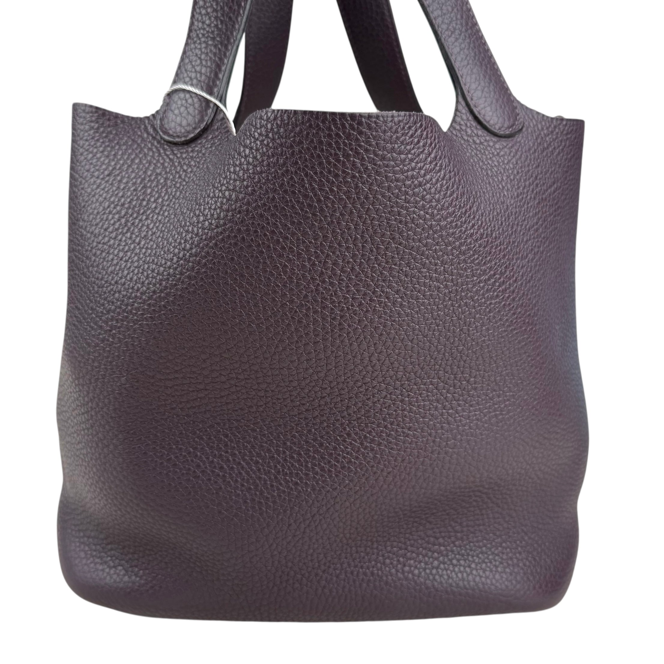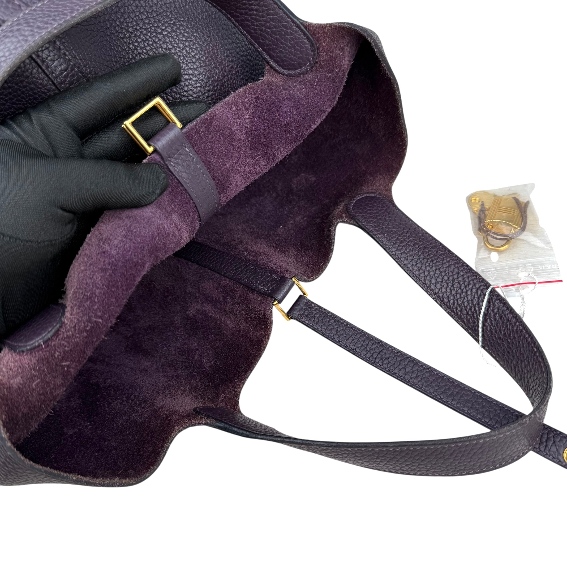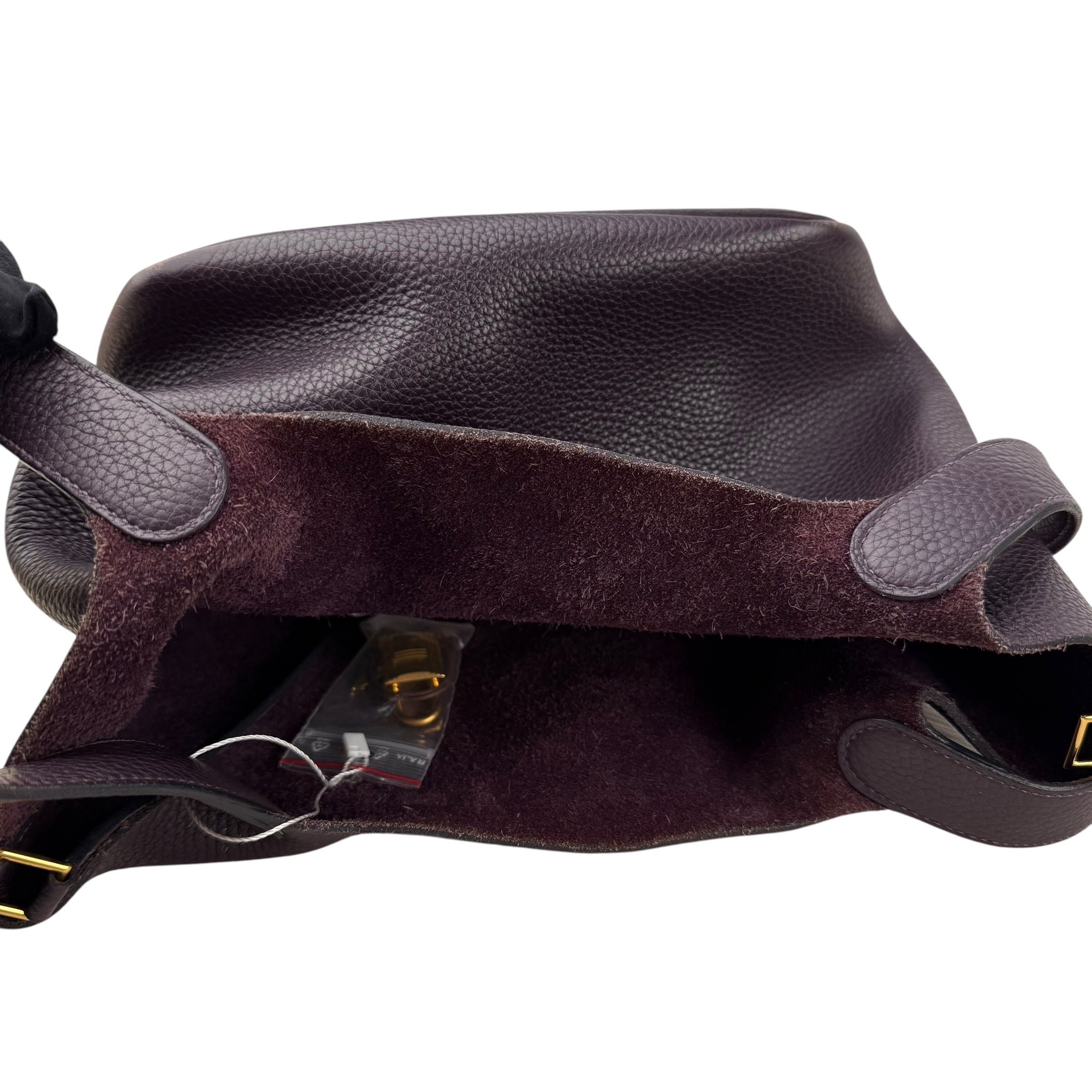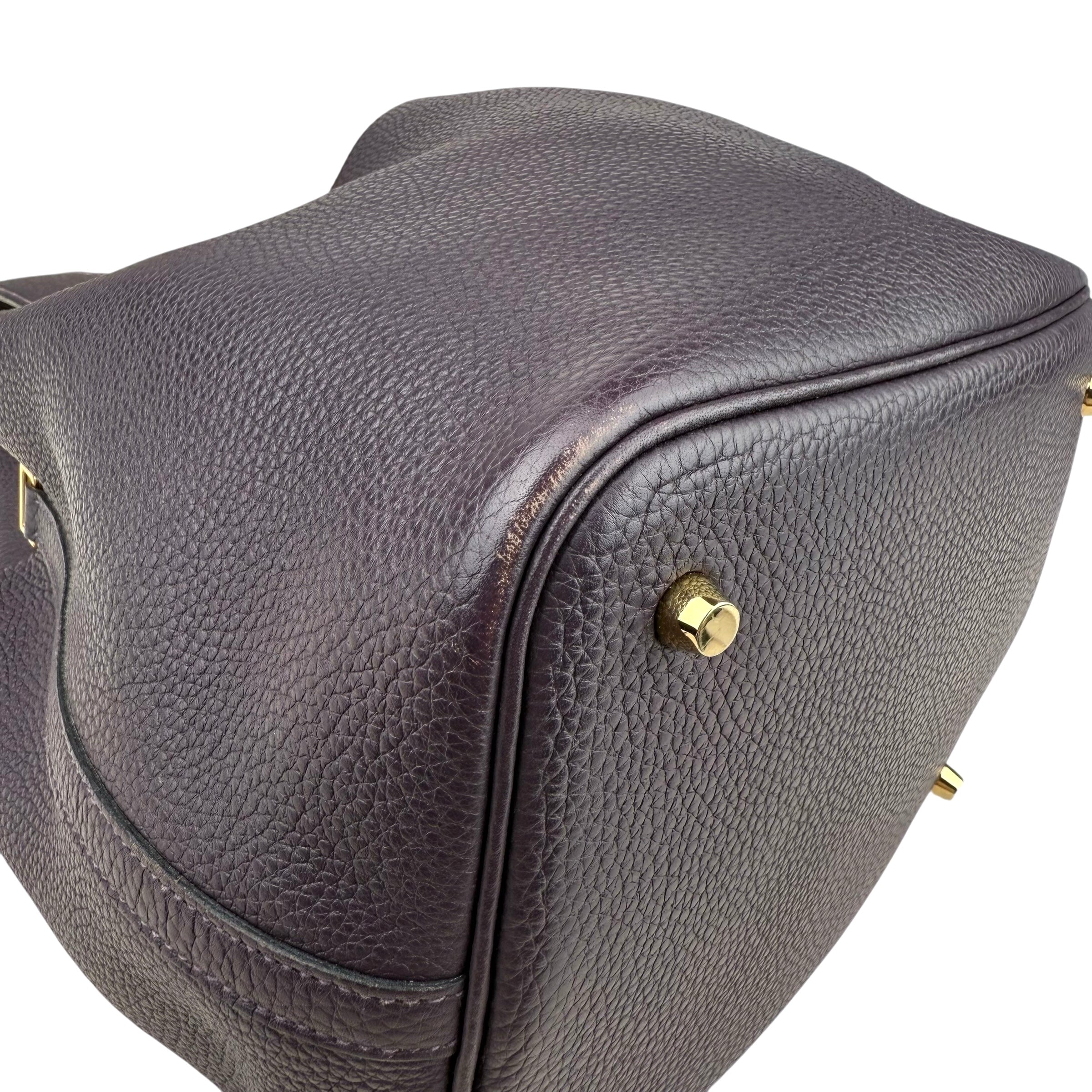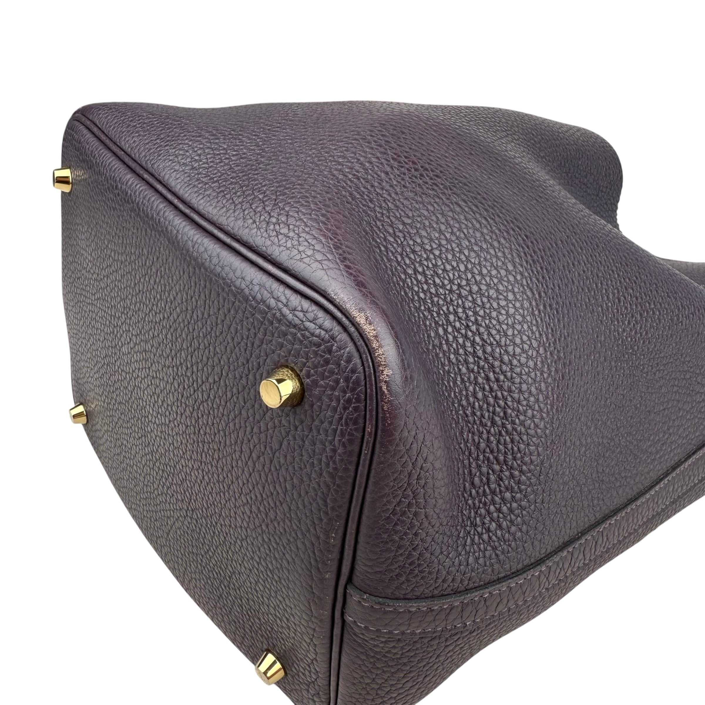 Size 18, dark purple colour Leather: very good condition,small rubbing of corner Metal fittings: very good condition,small scratches Handle/Strap: very good condition Inside: very clean, small rubbing of suede Accessories: lock, key
