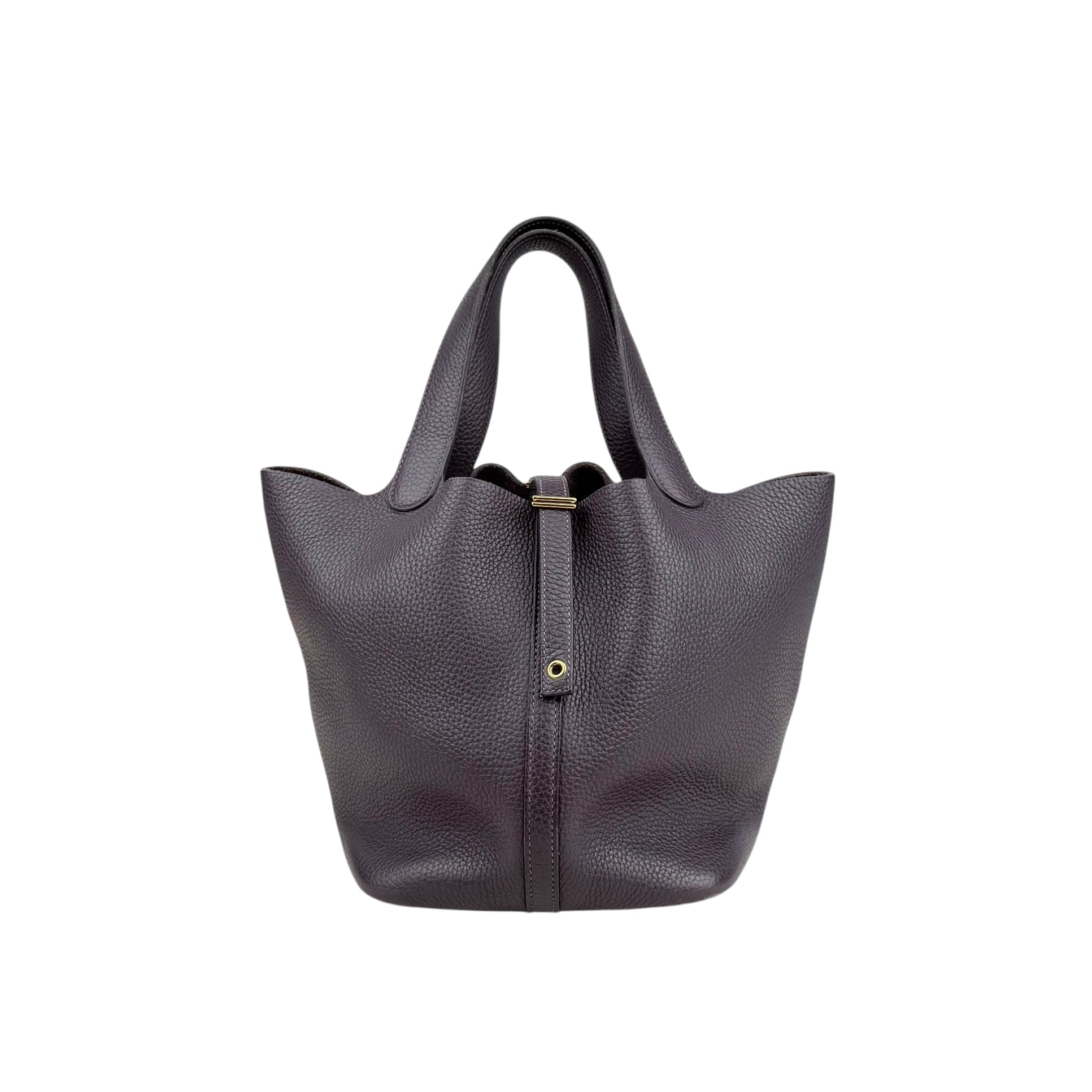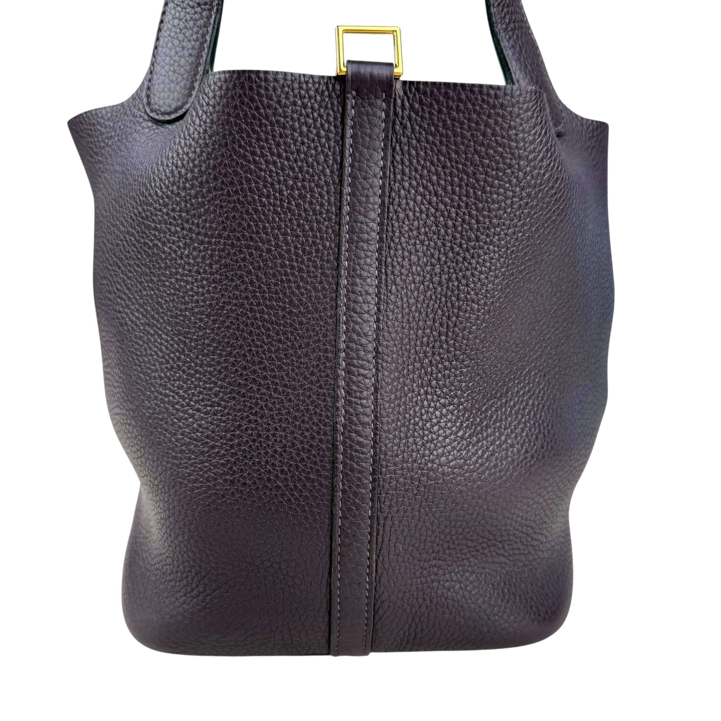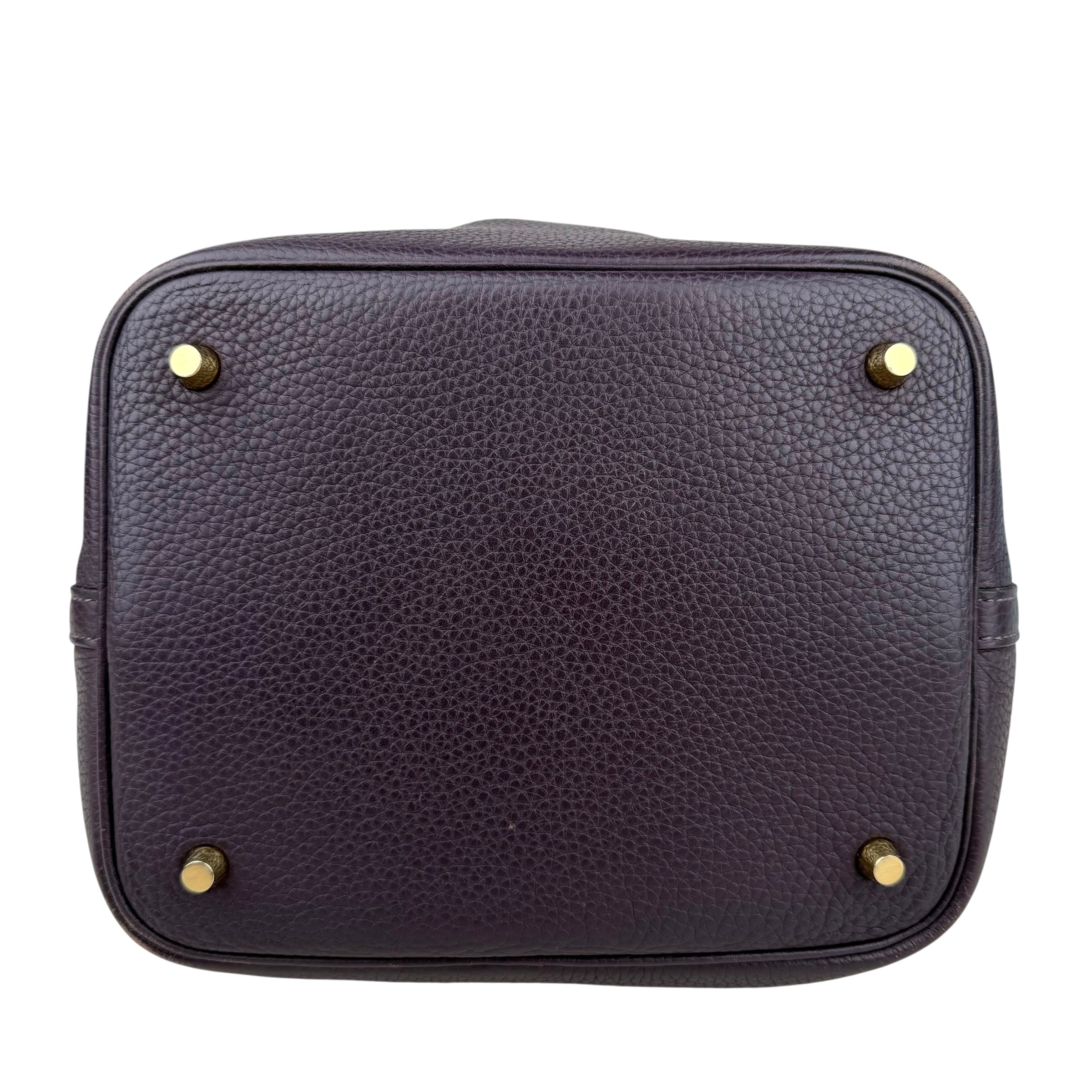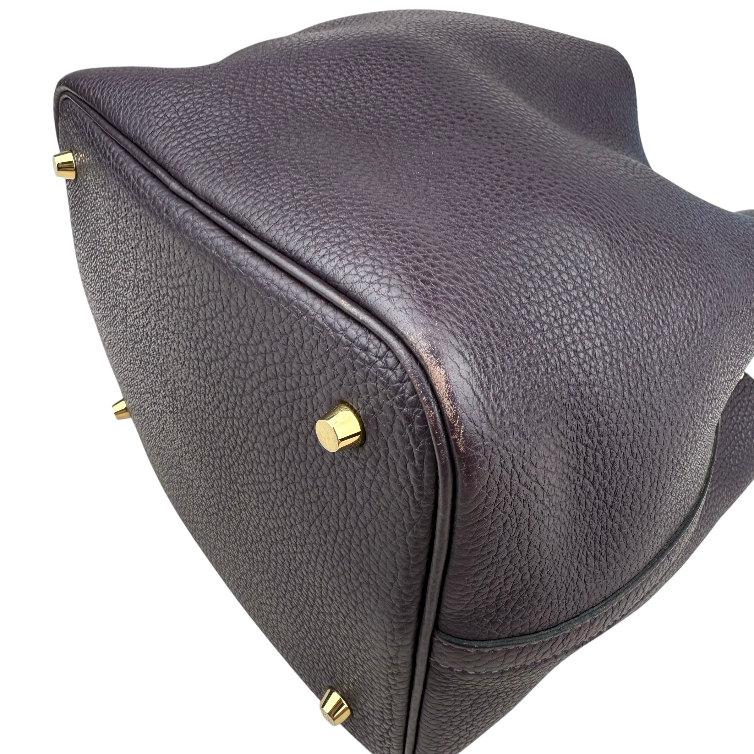 Size 18, dark purple colour Leather: very good condition,small rubbing of corner Metal fittings: very good condition,small scratches Handle/Strap: very good condition Inside: very clean, small rubbing of suede Accessories: lock, key