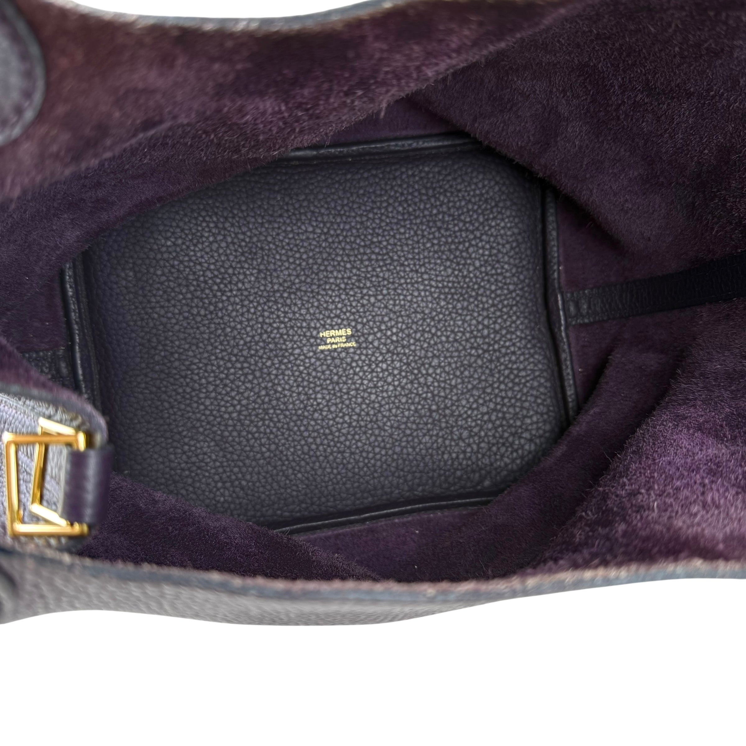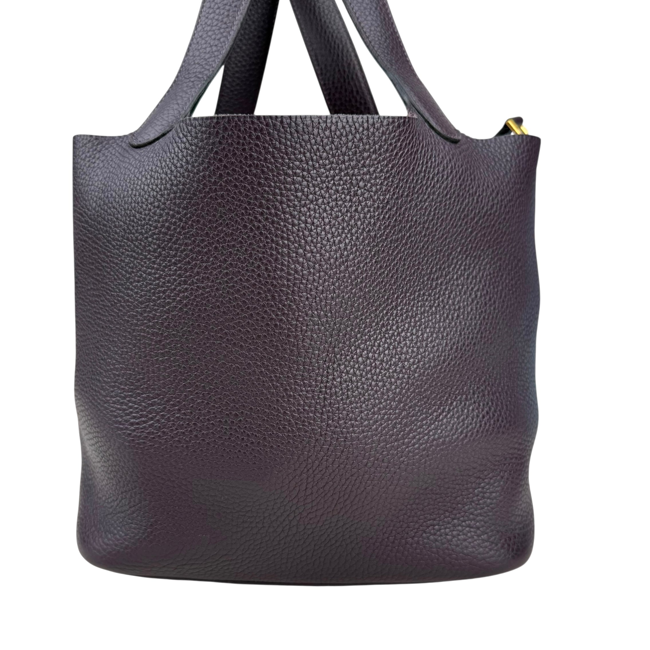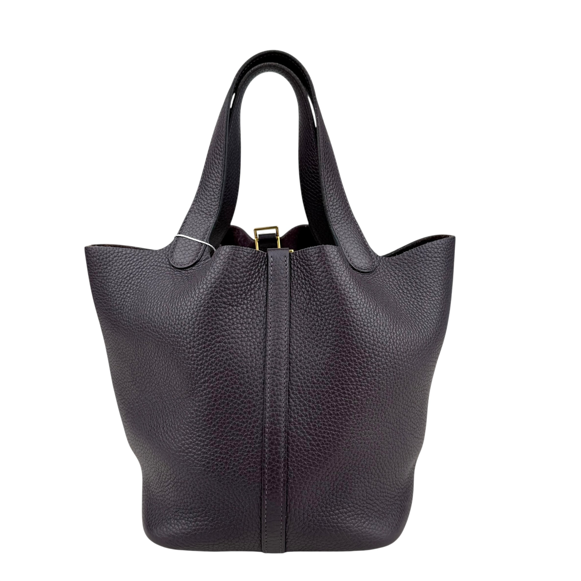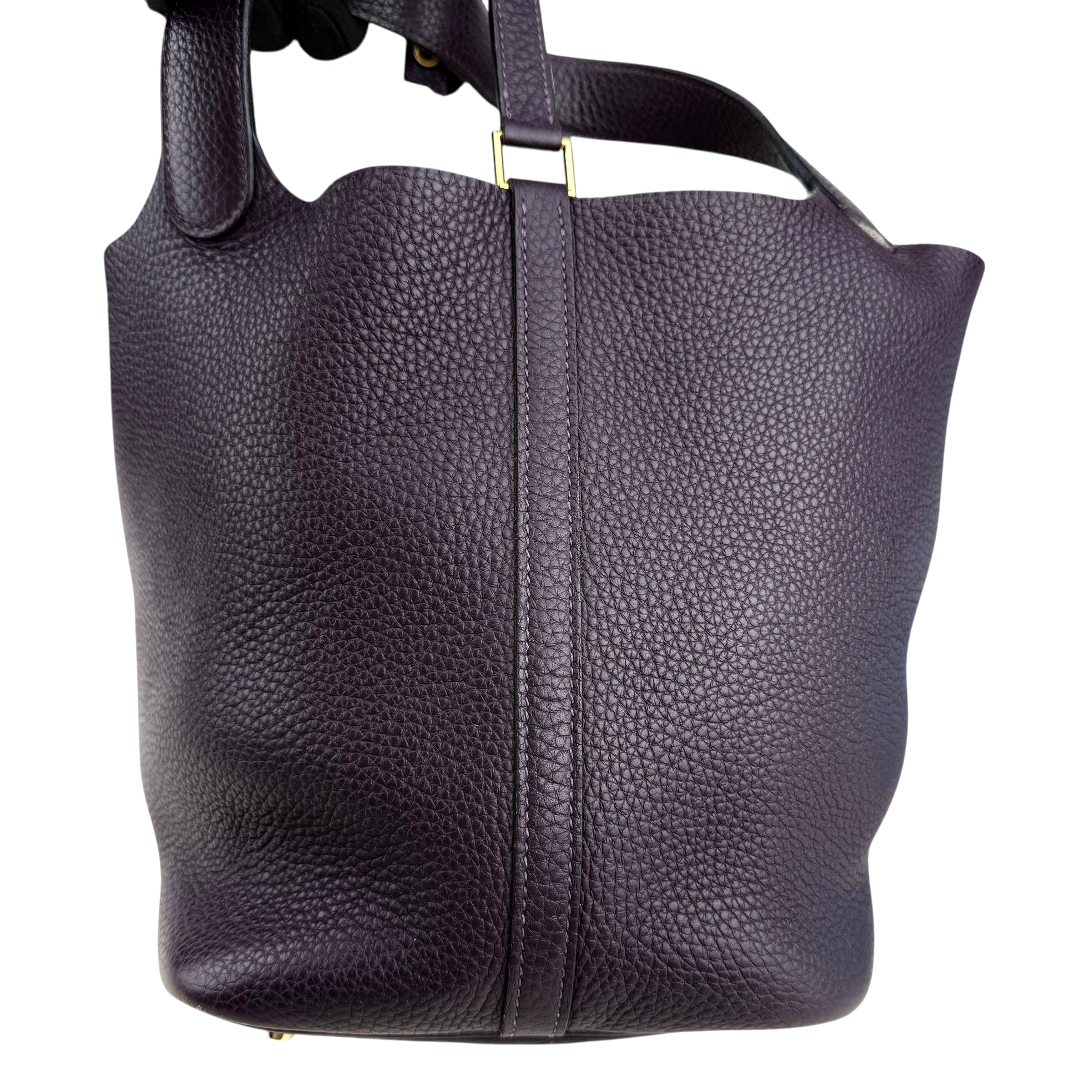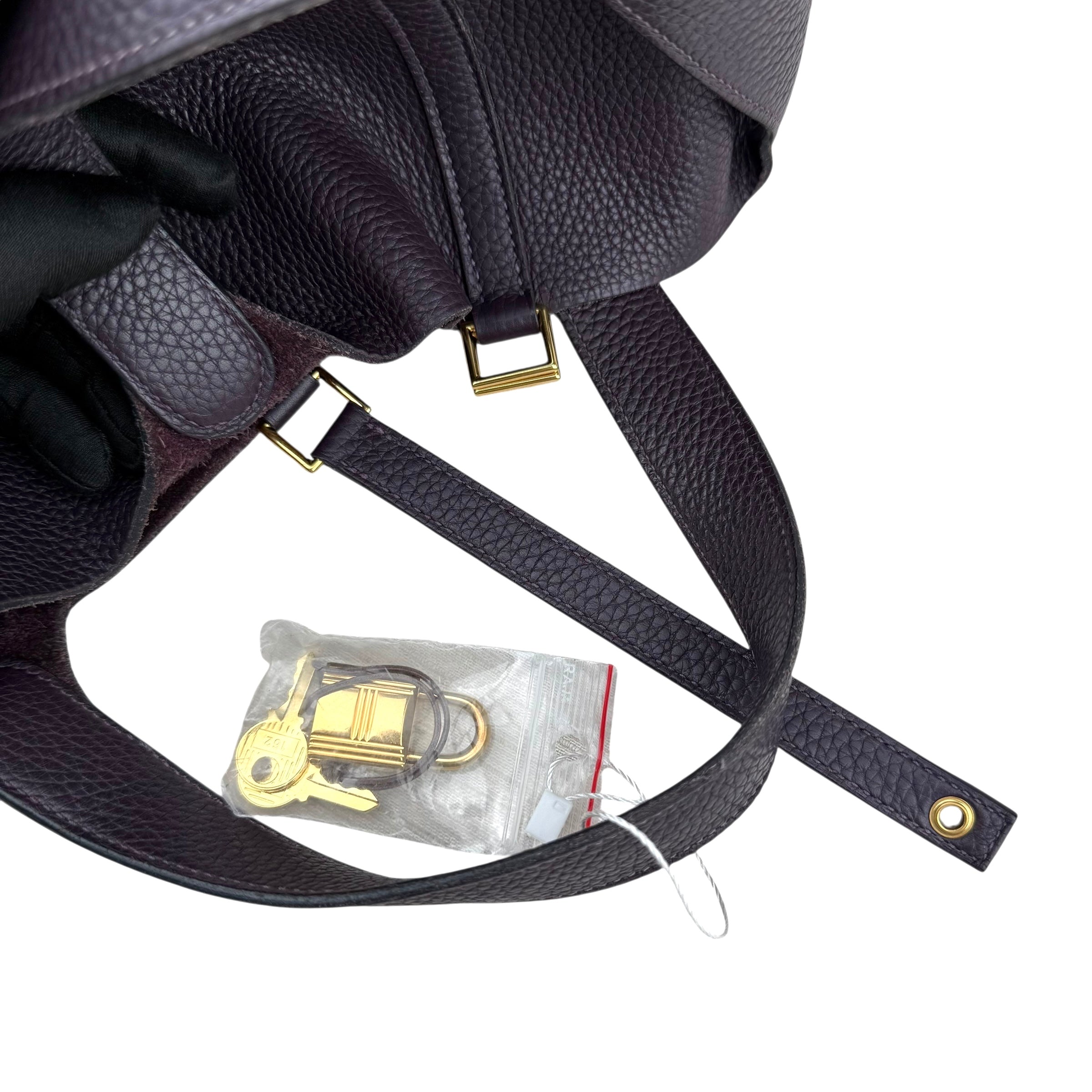 Size 18, dark purple colour Leather: very good condition,small rubbing of corner Metal fittings: very good condition,small scratches Handle/Strap: very good condition Inside: very clean, small rubbing of suede Accessories: lock, key